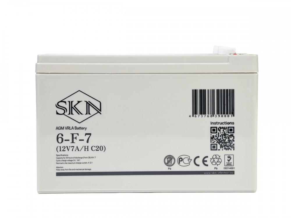 Аккумуляторная батарея SKN 6-F-7 разработана с применением технологии AGM и оснащена усиленными свинцовыми пластинами, разделёнными плотным сепаратором. Эта батарея не требует обслуживания на протяжении всего срока эксплуатации. Она отлично подходит для использования в системах безопасности и сигнализации, источниках бесперебойного питания, аварийного освещения, а также в лёгком и детском электротранспорте и других схожих областях.