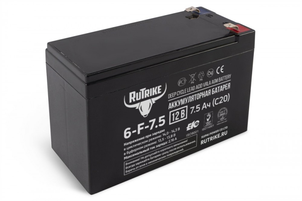 Аккумуляторная батарея Rutrike 6-F-7.5 выполнена по технологии AGM и состоит из утолщённых свинцовых пластин и плотного слоя сепаратора между ними. Батарея не требуют обслуживания на протяжении всего цикла эксплуатации. Отлично подходит для работы в системах безопасности и сигнализации, системах бесперебойного питания, системах аварийного освещения, в лёгком и детском электротранспорте и в других схожих сферах применения.