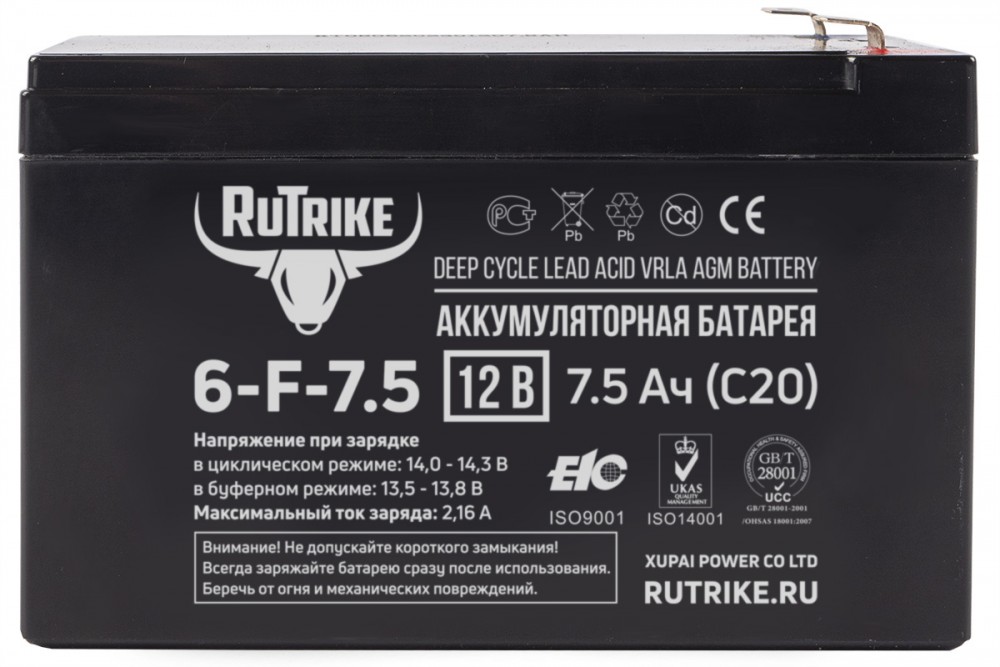 Зарядка должна осуществляться оригинальным зарядным устройством Rutrike, или проверенным, соответствующим характеристикам устройством заводского изготовления в соответствии с инструкцией к этому зарядному устройству и требованиями к напряжению и силе тока. Зарядное устройство должно быть импульсным, полностью автоматическим, с функцией десульфатации пластин, специально предназначенное для тяговых аккумуляторных батарей.