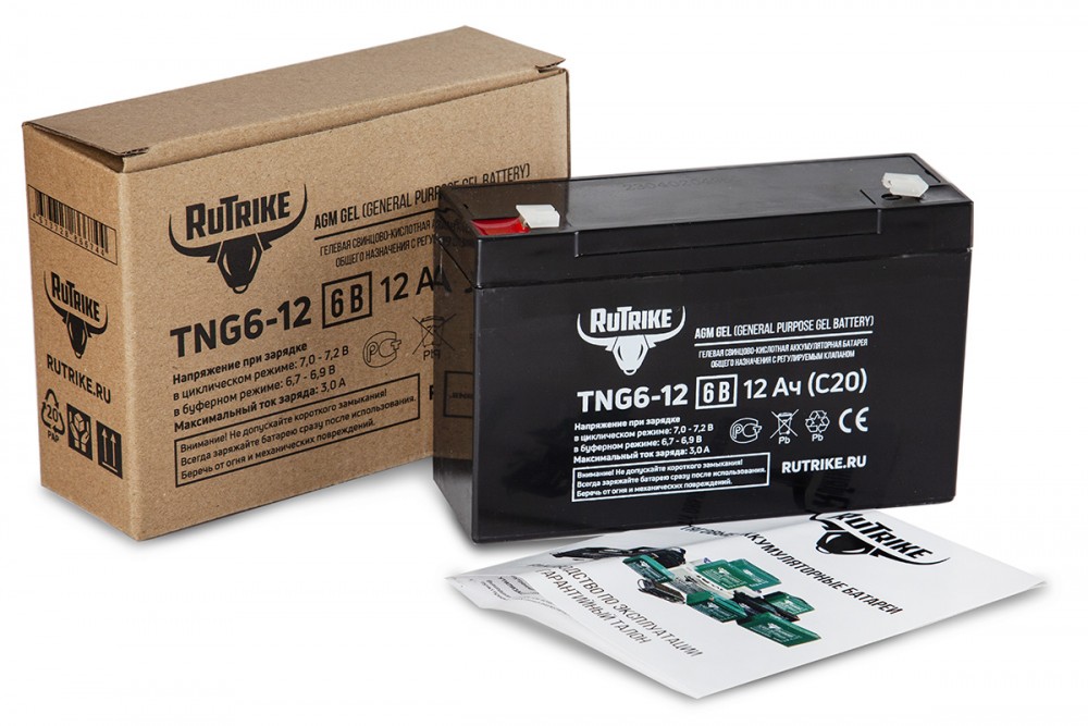 Тяговый аккумулятор RuTrike TNG6-12 (6V12A/H C20) - это 6-вольтовая аккумуляторная батарея изготовленная с использованием технологии GEL AGM (Absorbent Glass Mat + густой электролит внутри стекловолоконного сепаратора), что делает ее идеальной для использования в качестве основного или резервного источника питания в различных сферах применения, таких как: