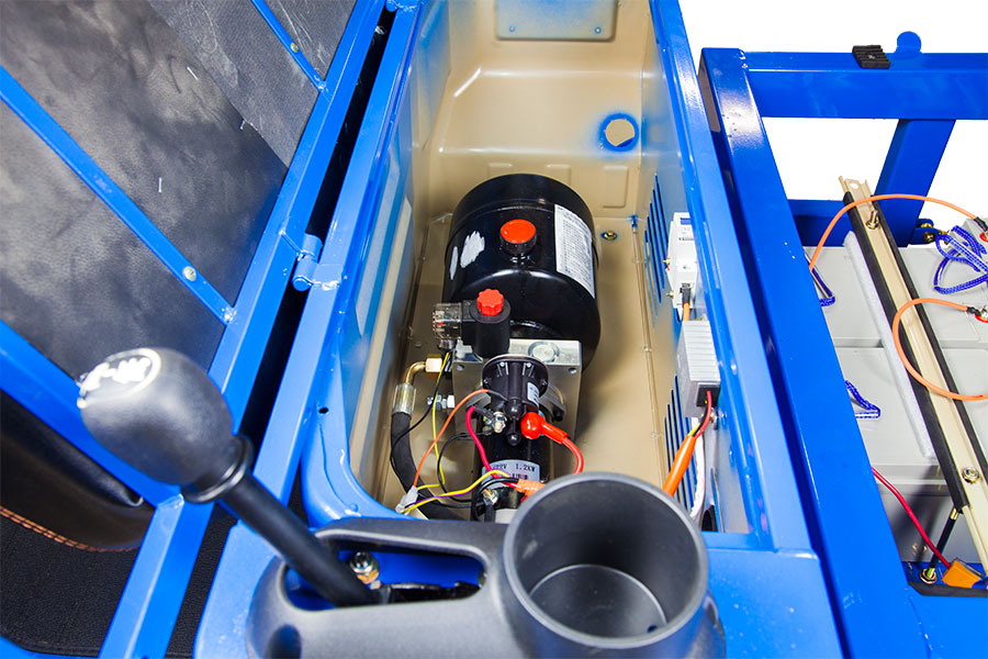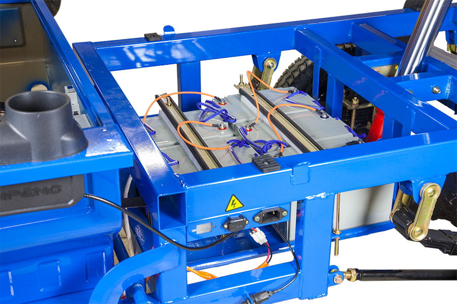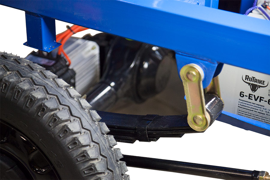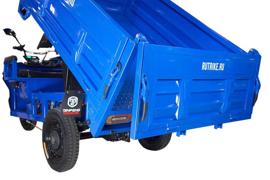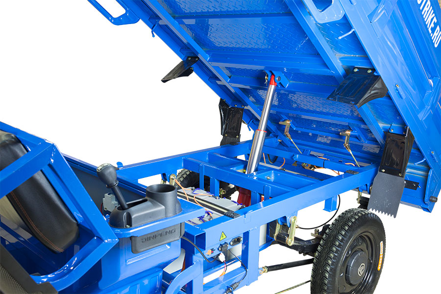 Электрический трицикл Rutrike D5 оснащен крепким и вместительным кузовом с высокими бортами и гидравлическим подъемным механизмом, позволяющим быстро осуществлять погрузку-разгрузку. Мощный гидравлический подъёмный привод позволяет поднимать кузов с загрузкой до 400 кг. А общая грузоподъёмность трицикла составляет до 900 кг.