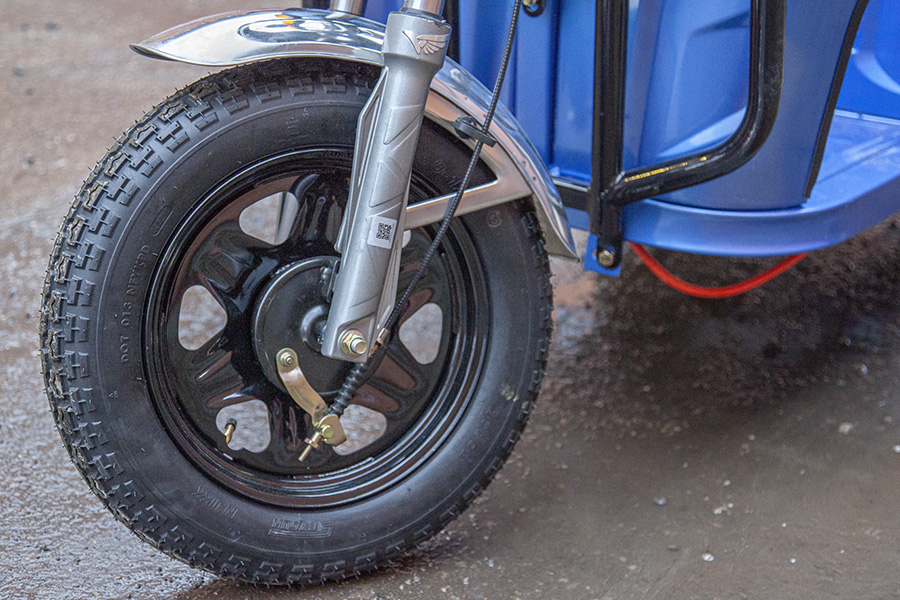 Переднее и заднее колёса радиусом 12 дюймов комплектуются покрышками с развитыми грунтозацепами. В процессе езды, электрический трицикл обладает повышенной устойчивостью и хорошей маневренностью, даже в груженом состоянии. На трицикле штатно установлена противоугонная сигнализация.
