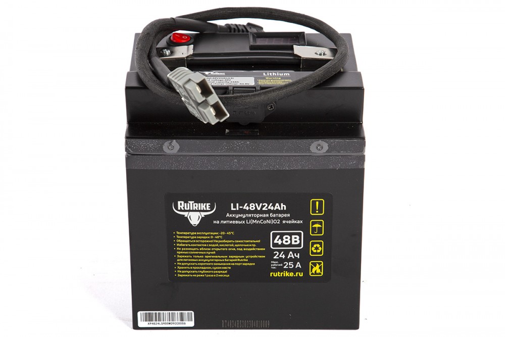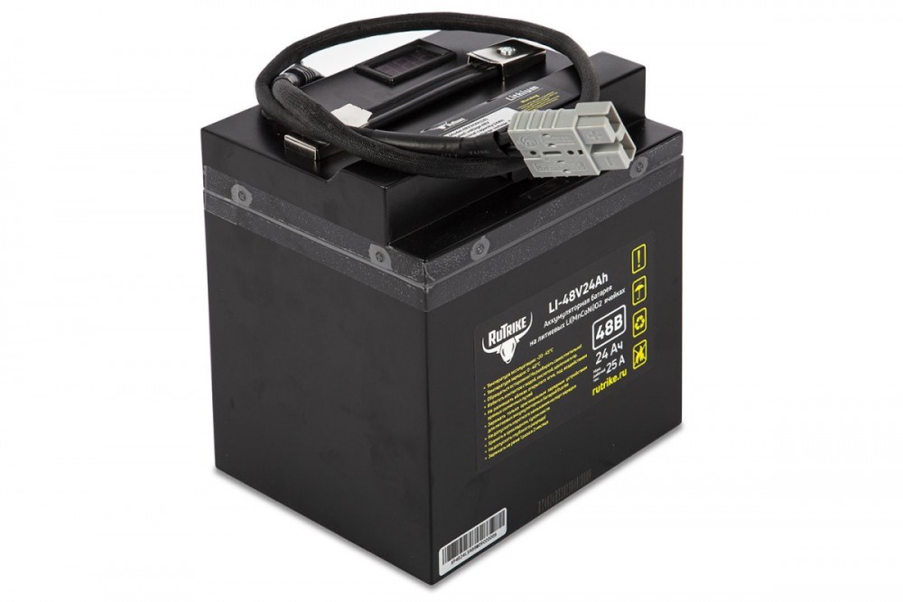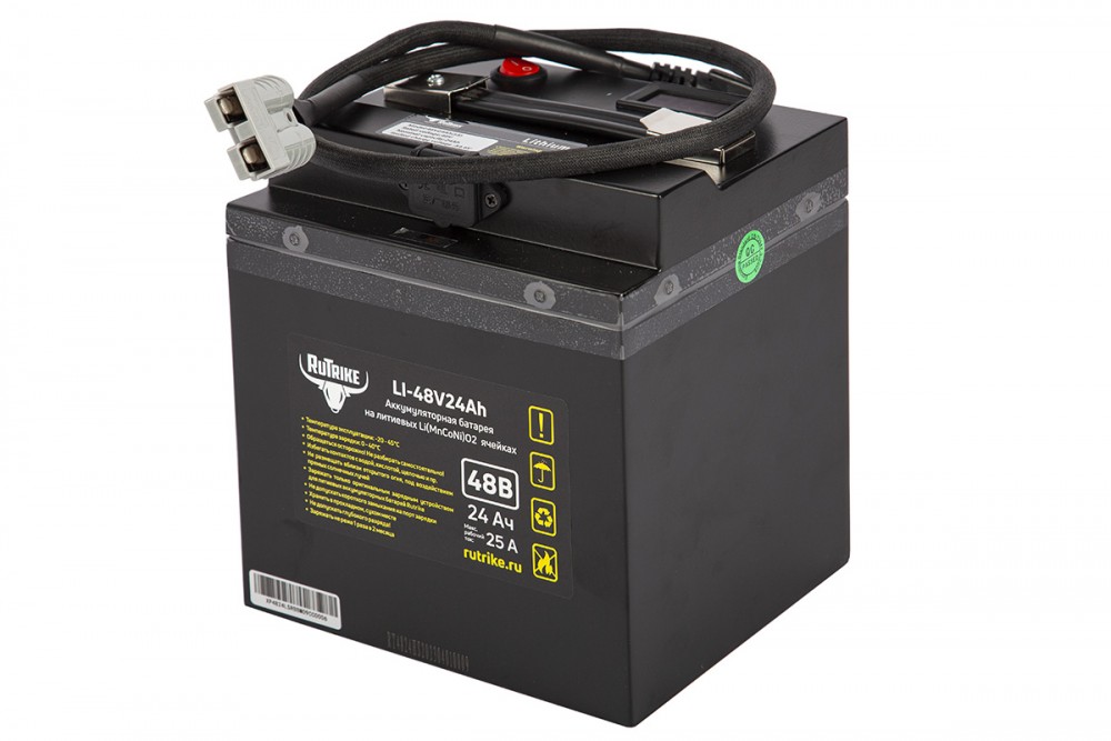 Аккумулятор RuTrike 48V24A/H Li(MnCoNi)O2 предназначен для устройств большой мощности. Имеет увеличенный срок службы (более 5 лет), высокую производительность и неприхотливость к погодным условиям (рабочие температуры: от -15 до +60°С).