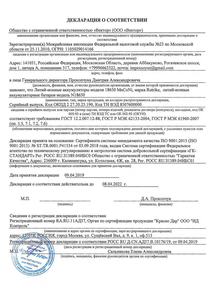 Наличие сертификата или декларации гарантирует качество и безопасность аккумуляторной батареи и её соответствие стандартам, утверждённым в Российской Федерации.