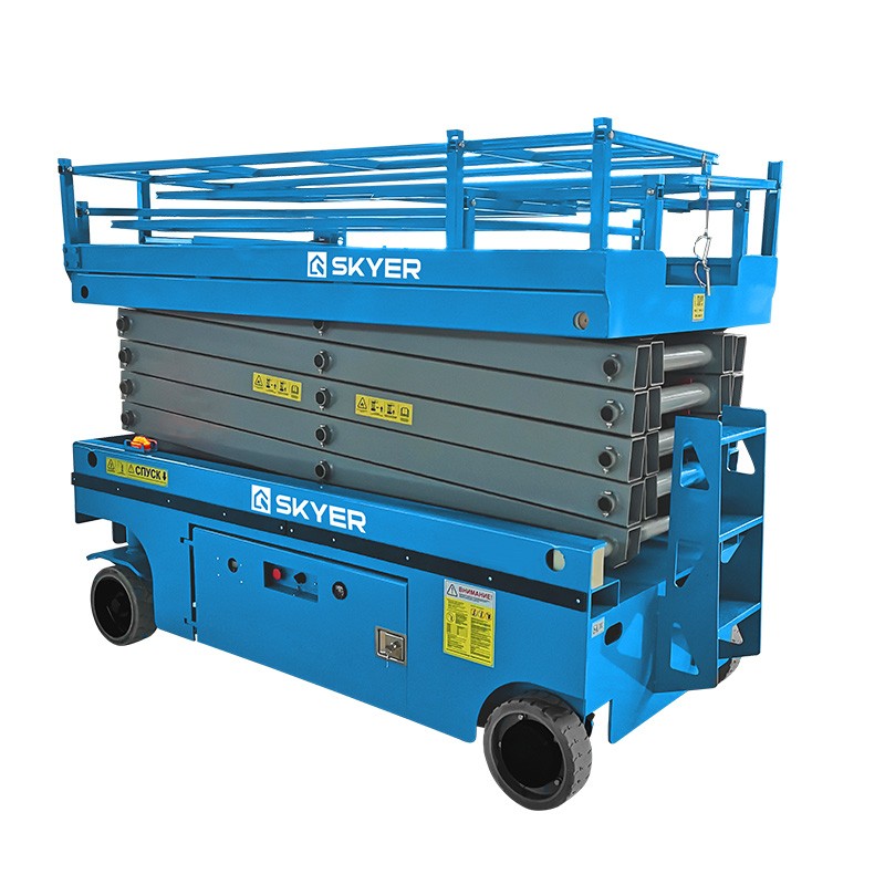 Ножничный подъемник SKYER PL1435-S плавно и быстро поднимает до двух человек со всем необходимым инвентарем и материалами для проведения работ на высоту до 12 м. Для производства представленной модели используется усиленный металл, а конструкция имеет ряд важных особенностей, делающих высотные работы безопасными.