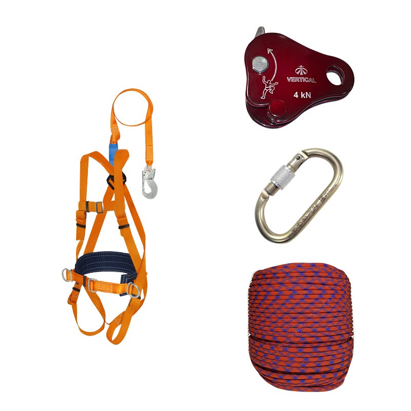 Комплект состоит из высокопрочной страховочной статической веревки, карабина с защитой от самопроизвольного открытия, страховочной привязи с пятью точками крепления и страховочного устройства «Капля» с функцией самоблокировки. Привязь обеспечивает максимальную защиту рабочего, ее размер может регулироваться. При изготовлении накладок для ног используется влагоотводящая сетка — это обеспечивает дополнительный комфорт при длительной эксплуатации страховочной привязи.