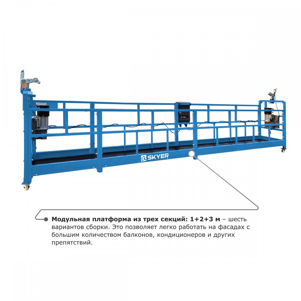 Строительная люлька SKYER SKR6 — это прочное, безопасное, многофункциональное строительное оборудование с тщательно продуманной конструкцией. Платформа имеет 3 секции и рассчитана на подъем сразу трех рабочих, а также необходимых для проведения работ инструментов и материалов. Максимальная грузоподъемность модели составляет 630 кг.