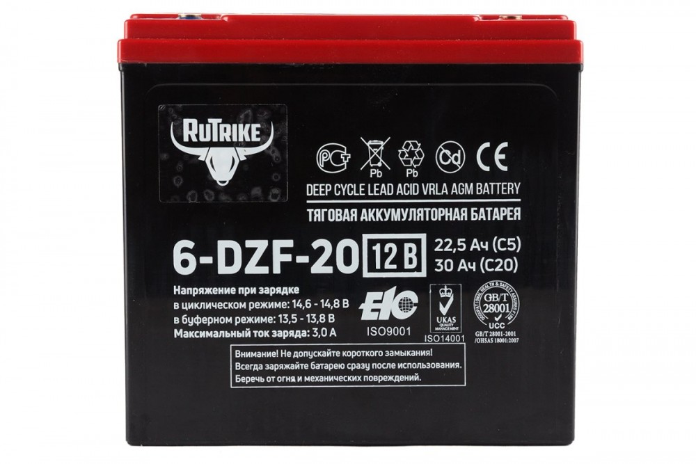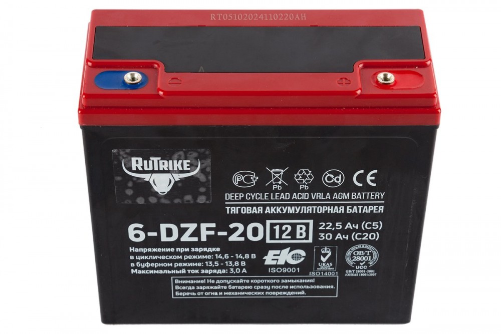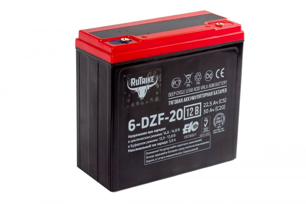 Необслуживаемая аккумуляторная батарея Rutrike 6-DZF-20 с системой рекомбинации газов (VRLA) произведена по технологии AGM. Батарея выполнена по технологии внутреннего формования. В толстых свинцовых пластинах используется экологичный сплав без кадмия и мышьяка.