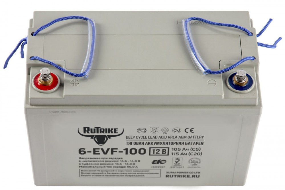 Тяговая аккумуляторная батарея Rutrike 6-EVF-100 поддерживает функцию быстрой зарядки с высокой силой тока до 50 Ампер, однако постоянно прибегать к быстрой зарядке мы не рекомендуем, поскольку количество рабочих циклов при постоянной зарядке с высокой силой тока снижается.