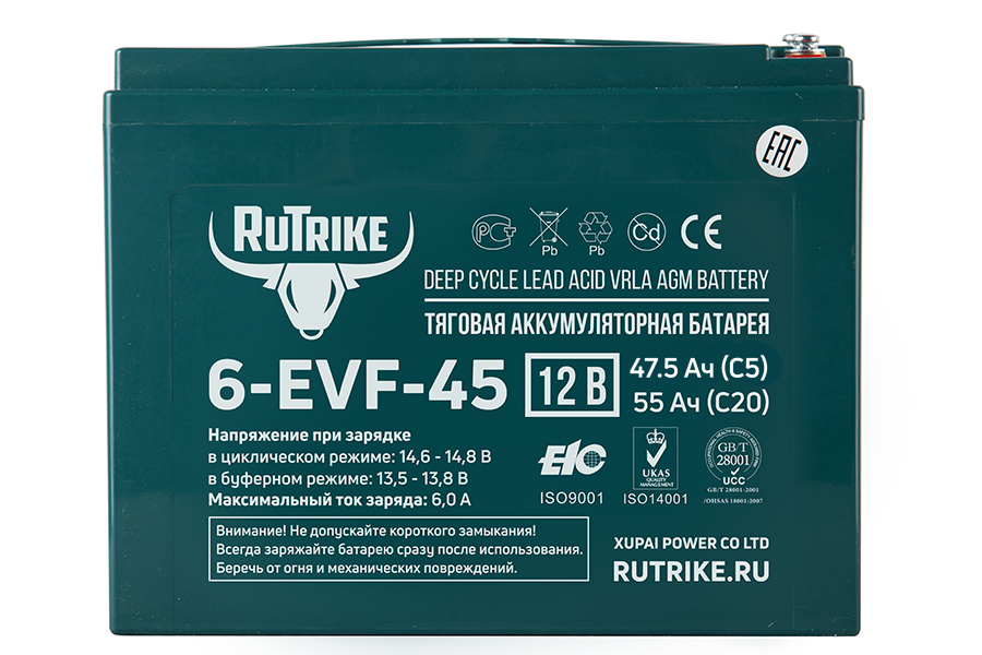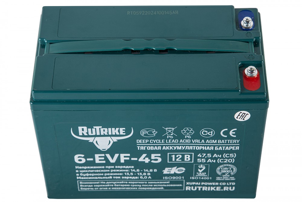 Rutrike 6-EVF-45 - необслуживаемая аккумуляторная батарея с системой рекомбинации газов (VRLA) произведенная по технологии AGM. Батареи выполнены по технологии внутреннего формования. В свинцовых пластинах, имеющих большую толщину по сравнению со стандартными аккумуляторами, используется экологичный запатентованный сплав без кадмия и мышьяка. Плотный сепаратор из углеволокна пропитан электролитом, изготовленным по технологии NANO GEL. Электролит находится в сгущенном состоянии, не даёт утечек и не требует долива воды на протяжении всего срока эксплуатации.