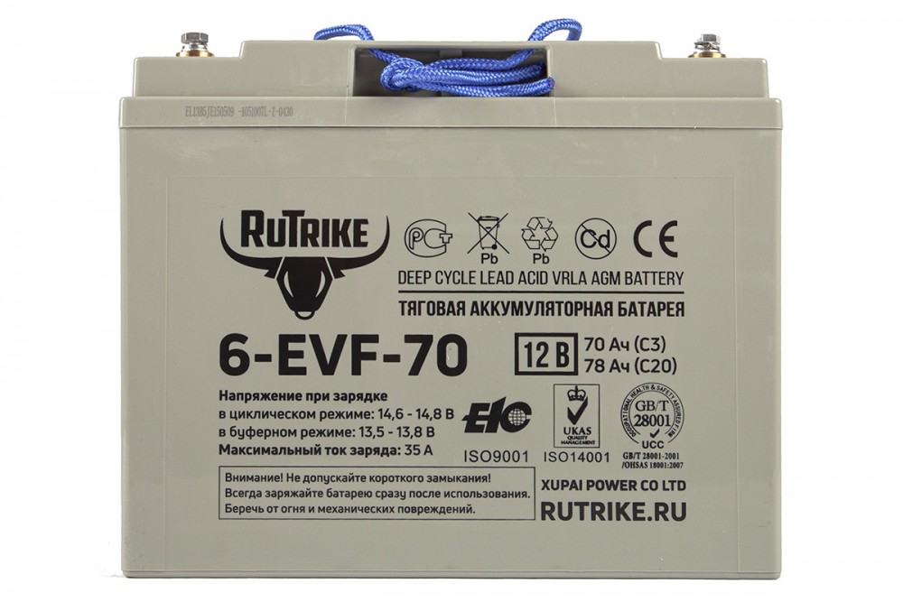 Тяговая аккумуляторная батарея Rutrike 6-EVF-70 поддерживает функцию быстрой зарядки с высокой силой тока до 40 А. Тем не менее, постоянно пользоваться "быстрой зарядкой" мы не рекомендуем, поскольку заряд с высокой силой тока сокращает количество циклов работы аккумуляторной батареи.