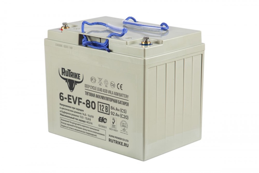 Тяговая аккумуляторная батарея Rutrike 6-EVF-80 поддерживает функцию быстрой зарядки с высокой силой тока до 40 А. Тем не менее, постоянно пользоваться "быстрой зарядкой" мы не рекомендуем, поскольку заряд с высокой силой тока сокращает количество циклов работы аккумуляторной батареи.