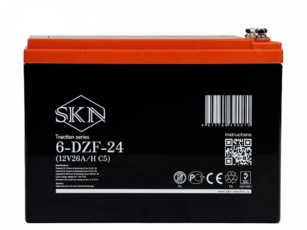 Необслуживаемая аккумуляторная батарея SKN 6-DZF-24 с системой рекомбинации газов (VRLA) произведена по технологии AGM. Батарея выполнена по технологии внутреннего формования. В толстых свинцовых пластинах используется экологичный сплав без кадмия и мышьяка.