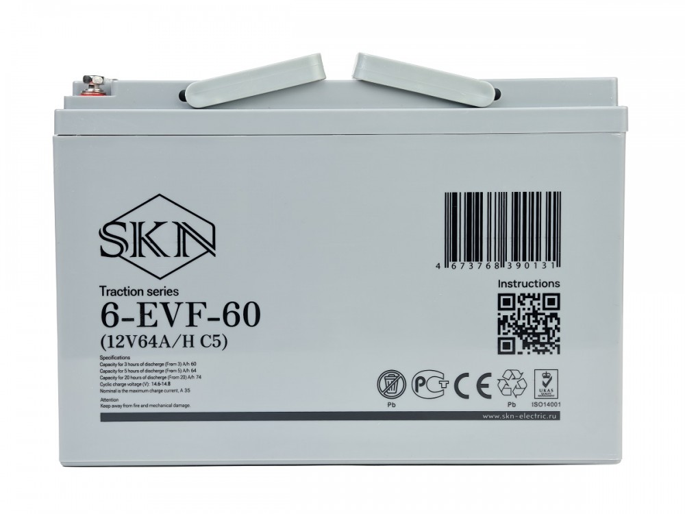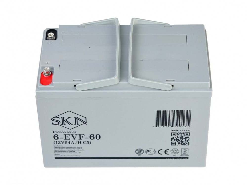 SKN 6-EVF-60 – это необслуживаемая аккумуляторная батарея, изготовленная по технологии AGM с системой рекомбинации газов (VRLA). Батарея произведена с использованием технологии внутреннего формования. В её свинцовых пластинах, которые имеют увеличенную толщину по сравнению со стандартными аналогами, применяется экологичный запатентованный сплав, не содержащий кадмия и мышьяка. Сепаратор из плотного углеволокна пропитан электролитом, созданным по технологии NANO GEL. Электролит находится в сгущенном состоянии, что исключает утечки и необходимость долива воды на протяжении всего срока службы.