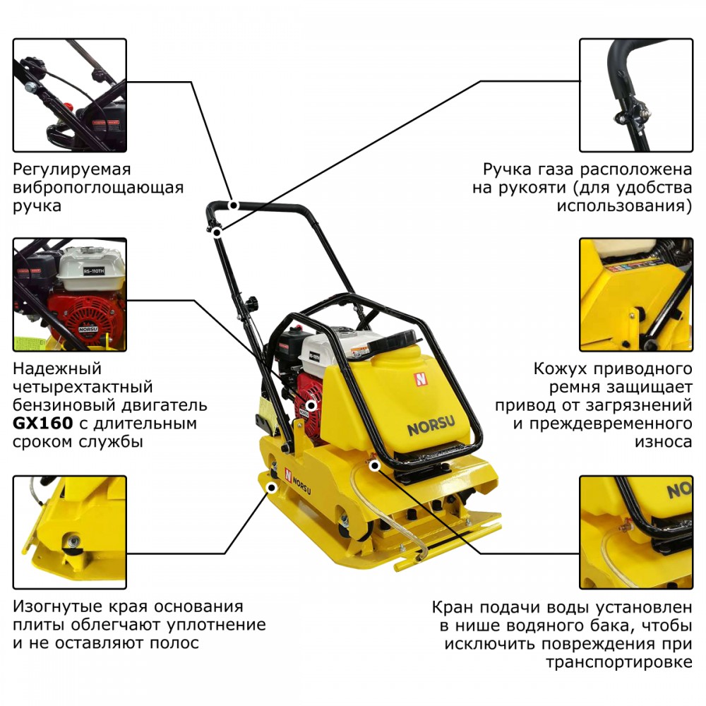 Виброплита бензиновая прямоходная NORSU RF-80TH (колесный комплект, бак для воды)