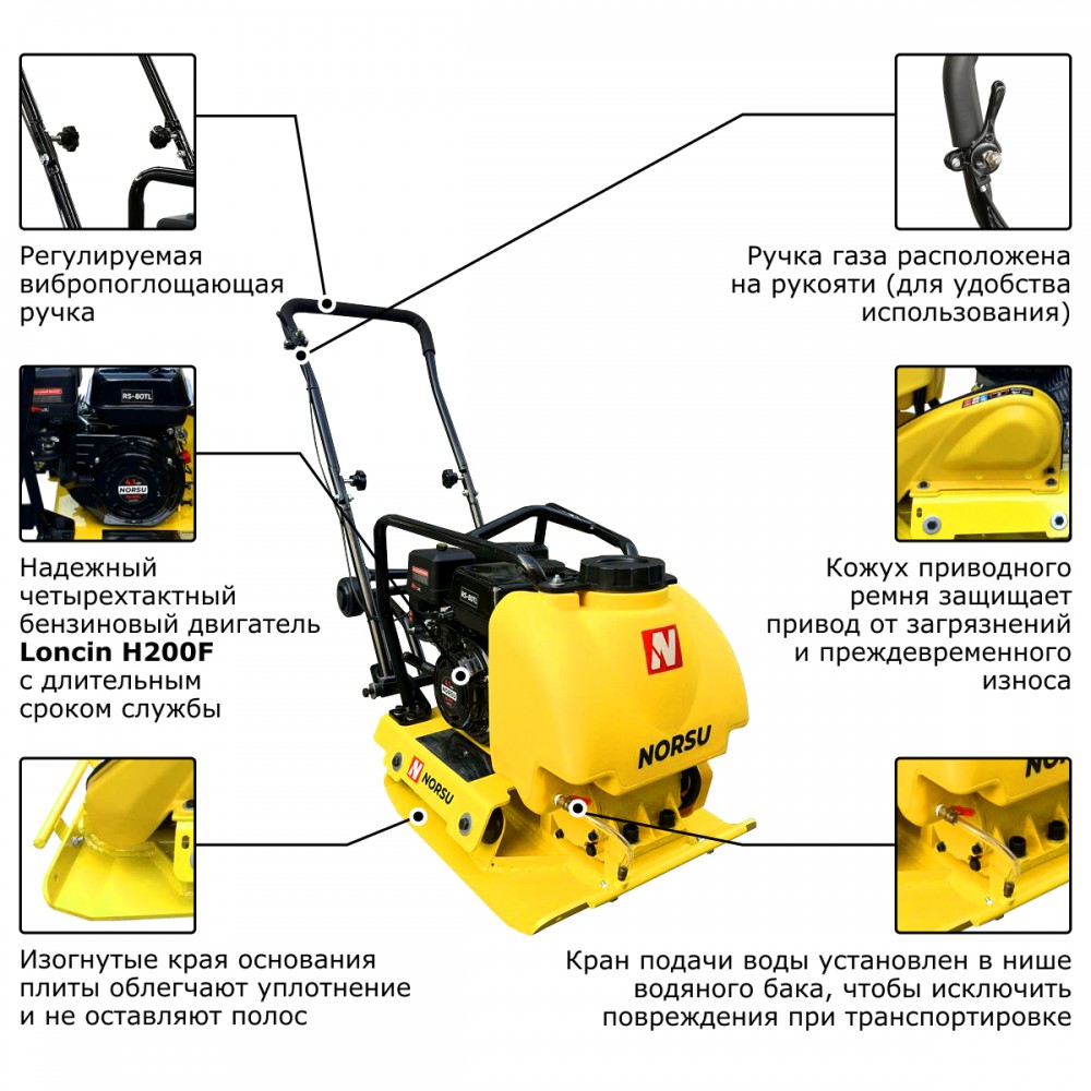 Виброплита бензиновая прямоходная NORSU RF-110TH (колесный комплект, бак для воды)
