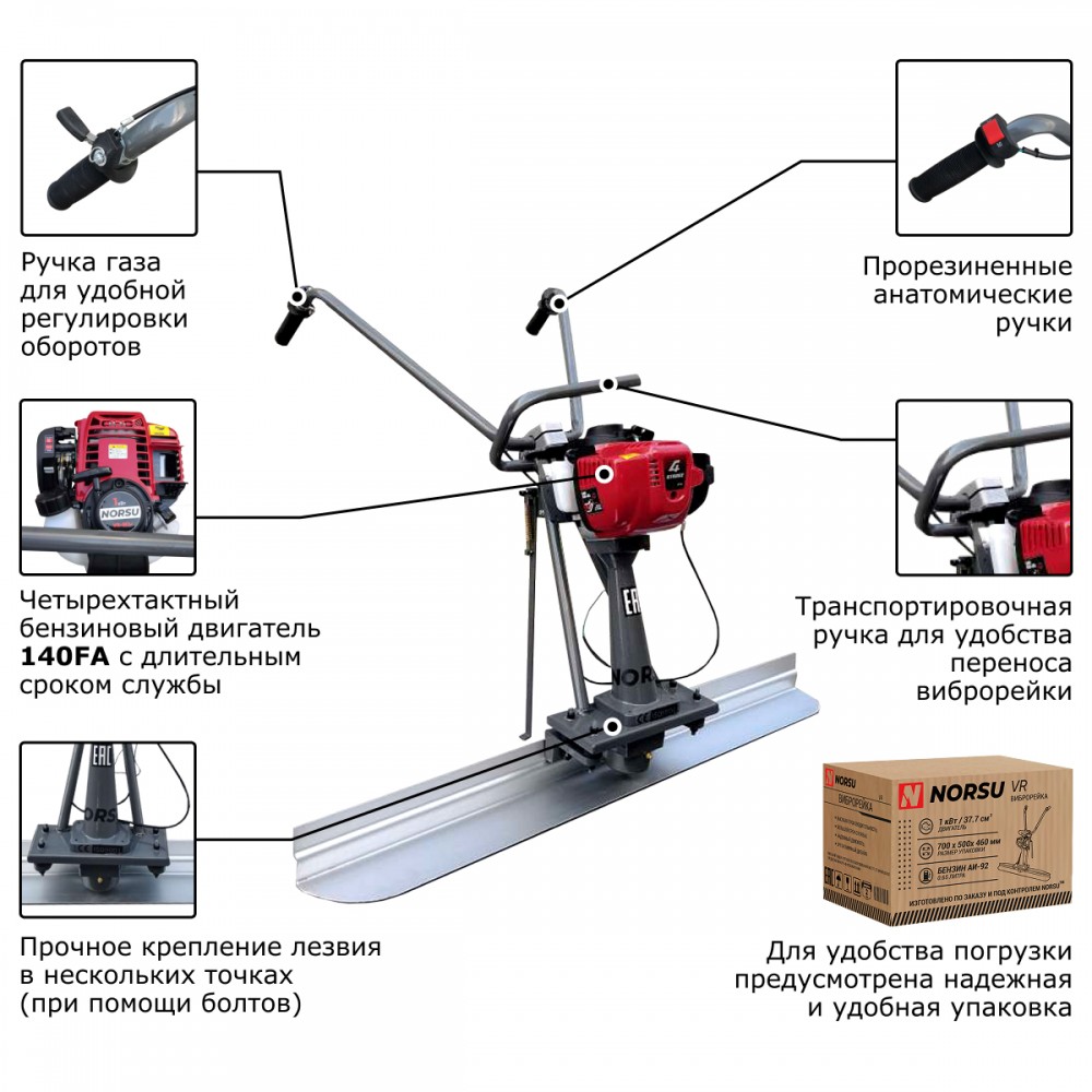 Виброрейка NORSU VR-80 — бензиновая модель, которая используется для равномерной укладки и уплотнения бетонных смесей. Техника удобна в эксплуатации, имеет небольшой вес (15.4 кг). На раме установлена опорная ножка, что позволяет обеспечить защиту элементов управления от загрязнений во время остановки. Виброрейка оборудована двигателем HUASHENG 140FA с объемом бака для топлива 0.65 л.