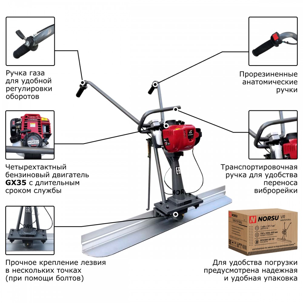 Виброрейка NORSU VR-80H — бензиновая модель, которая используется для равномерной укладки и уплотнения бетонных смесей. Техника удобна в эксплуатации, имеет небольшой вес (15.4 кг). На раме установлена опорная ножка, что позволяет обеспечить защиту элементов управления от загрязнений во время остановки. Виброрейка оборудована двигателем HONDA GX35 с объемом бака для топлива 0.63 л.