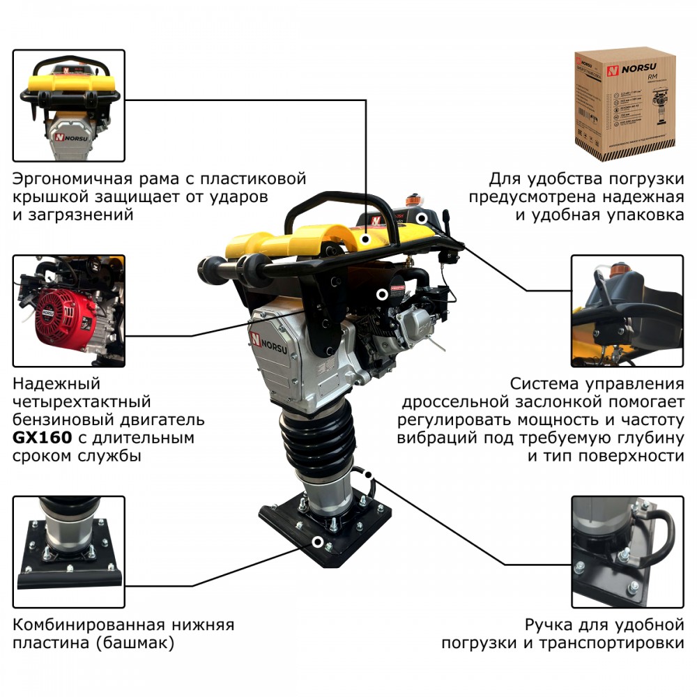 Вибротрамбовка NORSU RK-75H — это бензиновая модель с объемом топливного бака 2.8 л. Используется для уплотнения грунтов на глубину до 150 мм. Востребована при проведении дорожных работ, устройстве фундаментов, уплотнении краев тротуаров, пространства вокруг люков, при прокладке коммуникаций и создании ландшафтных композиций. Оборудована надежным двигателем NORSU GX160.